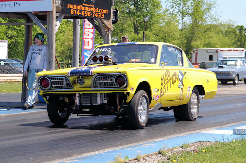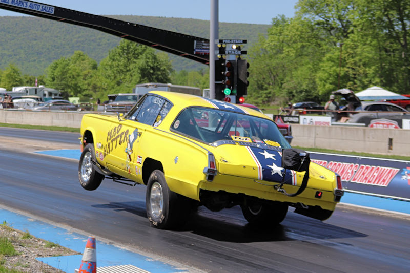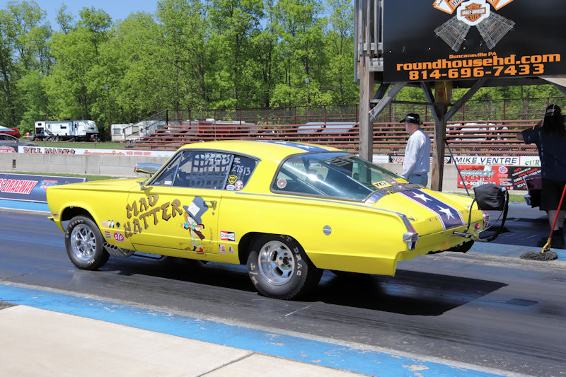 The Mopar or No Car event at Beaver Springs Dragway brought out a number of great cars and people, but one of the cars that really caught my eye was the ‘66 Plymouth Barracuda of Wallace Quarry. While the bright yellow paint and old-school paint scheme draws you in, you’ll notice something is different when you look closer. The car was built about 8 years ago, with the chassis of the car constructed by a friend of Wallace’s, appropriately nicknamed Gasser Dave. The car is capably powered by a 440 cu. in. engine, backed by a Powerglide transmission and a 12-bolt rear. It was built to be a light-weight racer and Wallace admitted he was still working the bugs out of it. This is where we get to the part of what really makes this car stand out. It was built in a way to specifically keep the old-school look with the altered wheelbase and leaf spring rear end just like in the A/FX days. The rear wheels were moved 12 inches forward and the front wheels were moved almost 16 inches, with the overall chassis actually shortened a bit. The look they were going for was to mimic a similar A/FX Barracuda that ran back in the day, and there’s no doubt that old look was captured perfectly. Wallace said they originally had a blown 392 Hemi for the car but decided to go with the 440 for practicality. At the time of this interview, the car had put down a best ET of 10.60, but Wallace was determined to try to launch the car harder to see what they could get out of it, saying, “but it’s a handful.” Wallace admitted that with the shortened wheelbase and straight front axle, this was a car you actually had to drive. That’s something all the old-school racers, along with current drivers who drive old-school cars can understand. As he puts it, “It’s not one of those cars you just get in and it shifts for itself and all that. It’s a ‘you-drive-it.’ ” Almost as equally impressive as the car is Wallace’s attitude towards it’s place in the sport; “You’ve gotta keep the history of it because if you don’t…if you forget where it came from, it will go away.” There is no doubt the Mad Hatter is keeping drag racing history alive because watching it come into the staging lanes is like being transported back in time to the earliest days of what would become the funny car class. Keep an eye out for this one at a track near you. You’ll be glad you did.