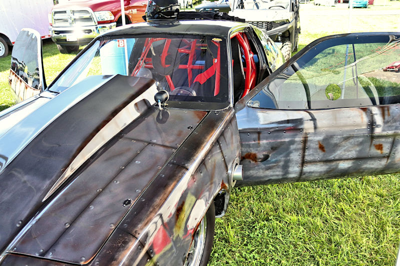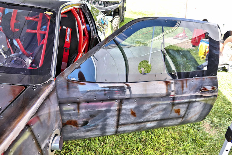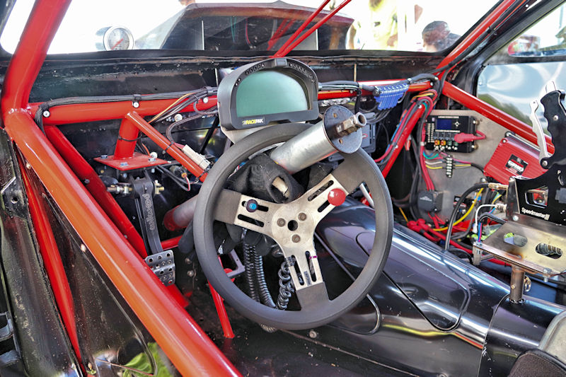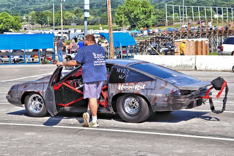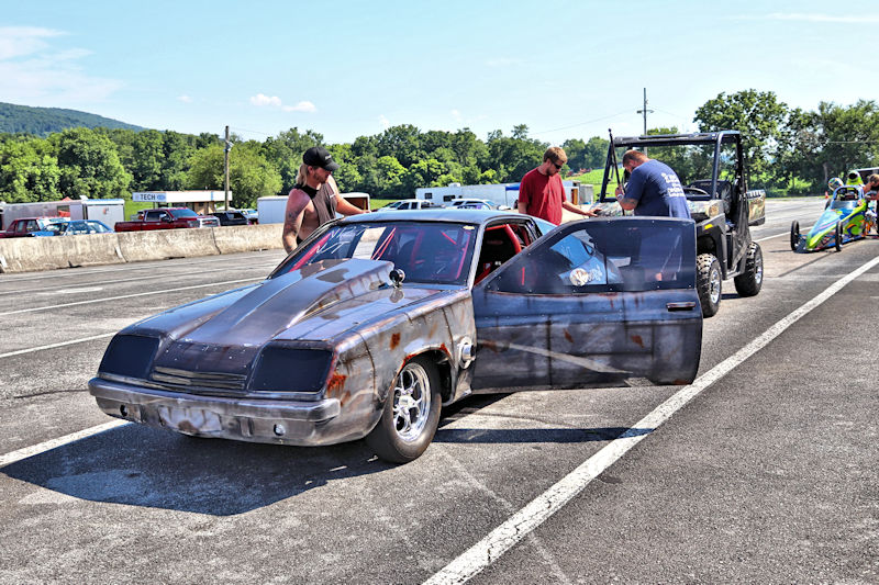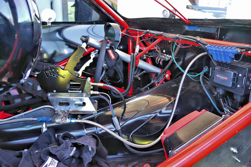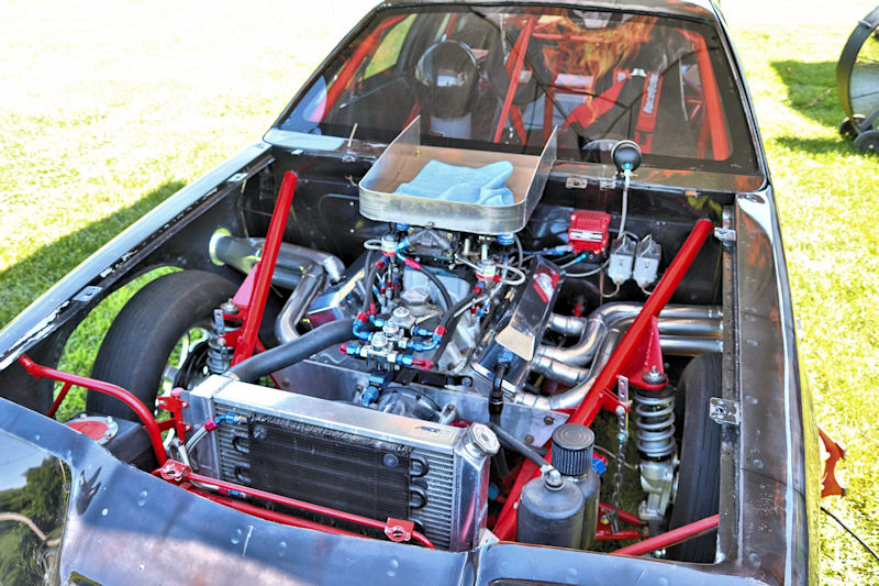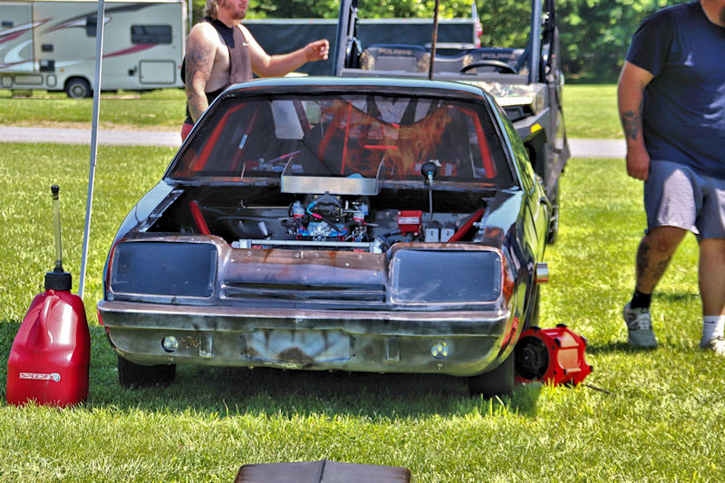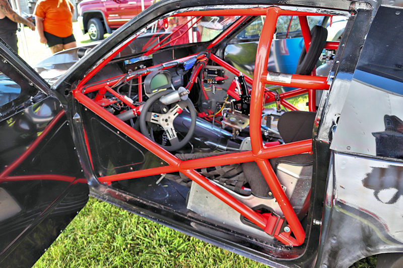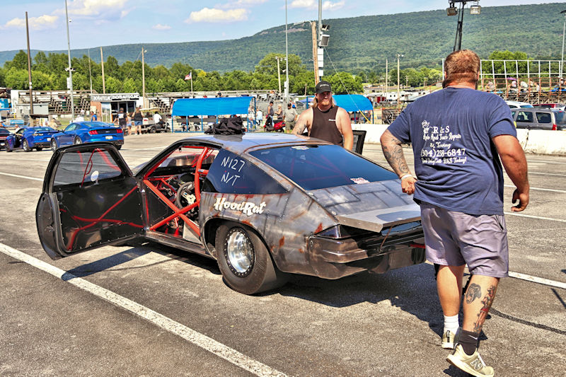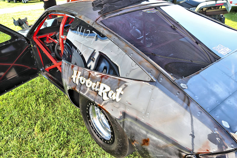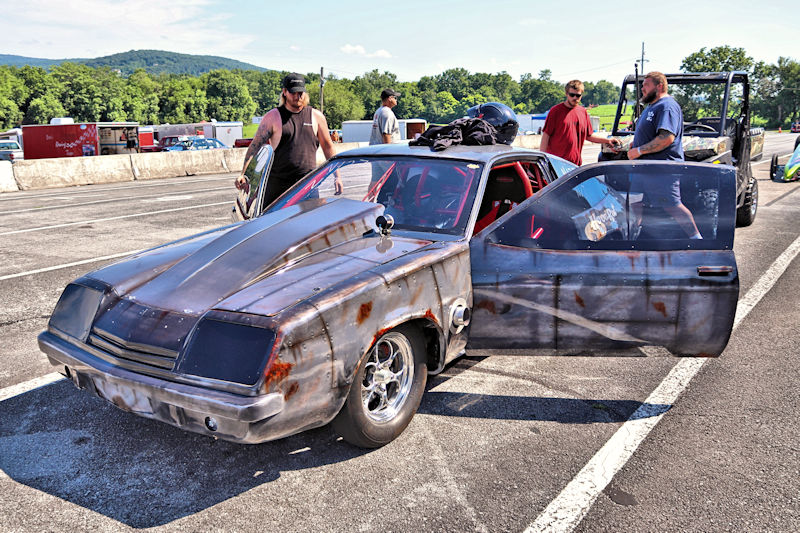 With that work done, they had the car primered and were in the process of trying to decide what color they wanted to paint it, then, as Justin says, “the guy who does stickers for our business suggested an airbrushed trash can and came in and spent a whole day airbrushing it.” After the “trash can” look was complete, Justin and his day clear-coated it the next day. I asked what kind of times the car runs and Justin told me, “It’s all new, we don’t have any [full] passes on it. Only a burnout and a 60-foot pass.” My curiosity got the best of me, so I had to ask what they expected from it. According to Justin, “It’s a “No-Time” car, so we can’t disclose any times.” He further explained to me how the “No-Time” class is heads-up racing with no times recorded. Having a car like this should make for some exciting days of competition ahead for this gang. Justin added that they’d been building this car for about 3-4 years and it’s all steel except for the hatch and front end. Even though the doors are gutted, they’re still about 60 pounds apiece. The whole purpose of the day was to do some testing to get a handle on the car and they had Kenny Fox showing up to help tune the car and get it all figured out.