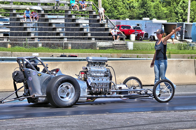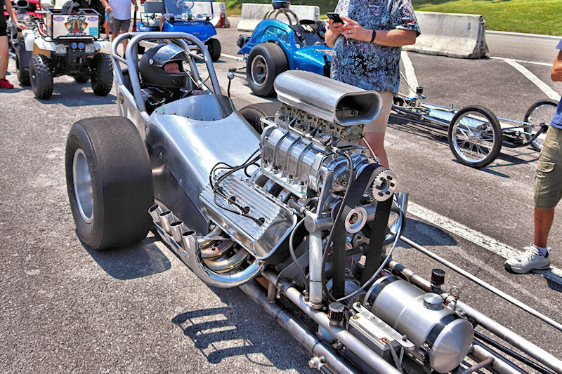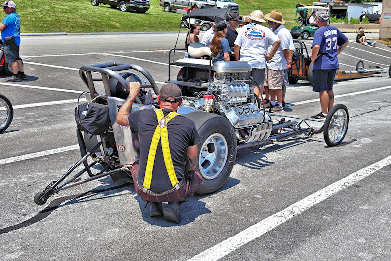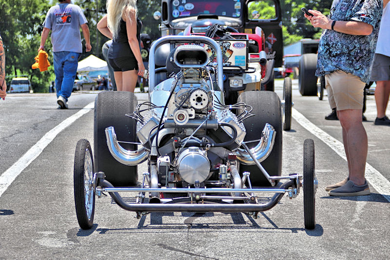 Mason Dixon Dragway – When guys back in the day were looking for ways to go faster, they started stripping cars down with some of them having little more than an engine and frame rails along with a seat to sit in (the birth of the term “rails”). That was soon refined into purpose-built rail dragsters. While most folks out there are only familiar with today’s extra long wheelbase dragsters, there are still some restored examples of the old ones out there to remember the roots of the class. And then there’s the vintage dragster of Rick Sturz. When asked how he got the desire to have one of these dragsters, Sturz revealed, “My friend Kevin’s dad had a front engine when we were kids.” His childhood desire obviously came true! Outer appearances would suggest it’s a nostalgic survivor of years gone by, but closer examination reveals it’s actually new. Sturz gives credit for that to Lance Rice of Rice Performance who built it new after doing a lot of chassis research. The car is based on a late 50s chassis design, but has safety updates to made it certible.