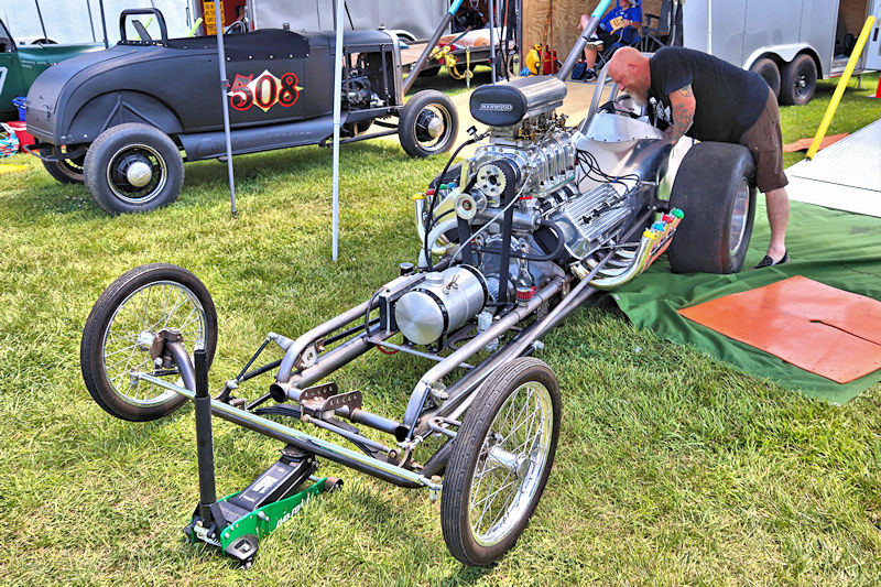 The dragster is not the only vintage racer Sturz has. Equally enthusiastic about the other car, Sturz explained, “We pulled that out of a barn, the guy’s father had put it away in 1962. The top was cut off and made into a roadster and when they tore the barn down, they found the top. I’m going to Bonneville with E.J. and we’re going to use that as a push vehicle. We put lights on it, it’s street legal, so we’re going to use it as the return in Bonneville. It’s a lot of fun doing this vintage stuff. I used to drag race regular. It’s about the people. Plus you get to have your adrenaline rush.”