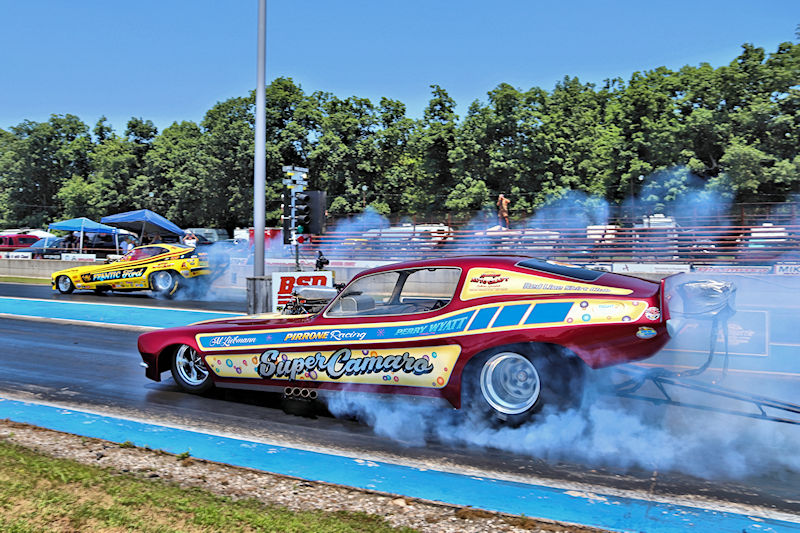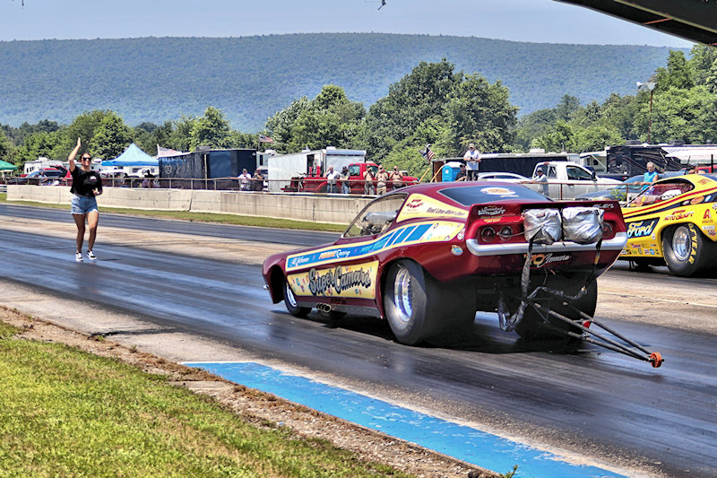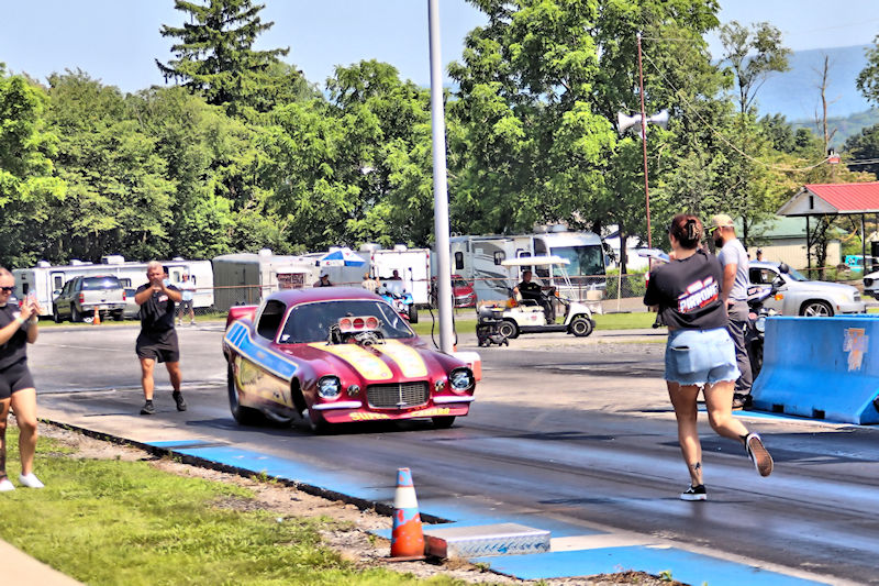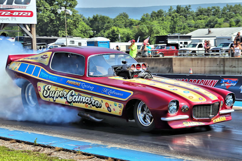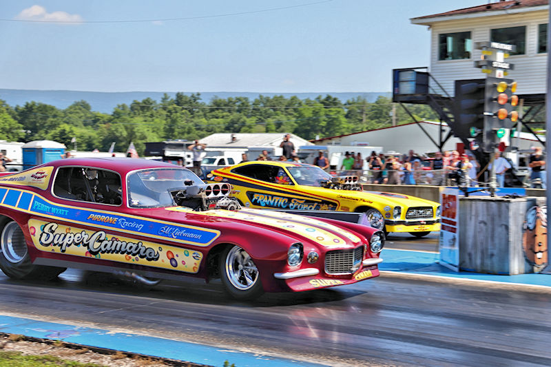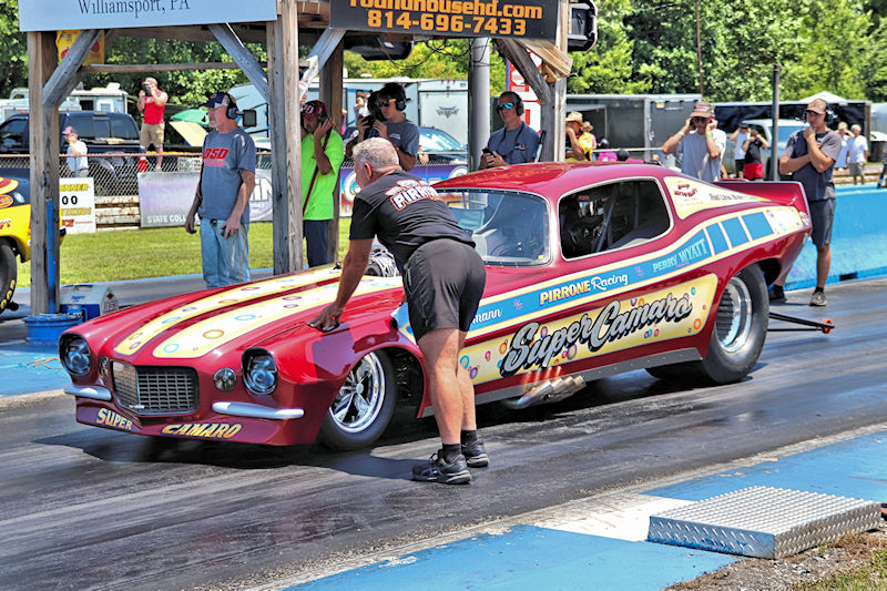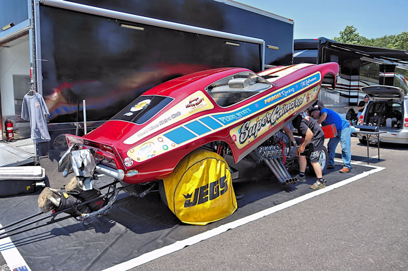 Beaver Springs Dragway – I caught up with Rocky Pirrone at the Nostalgia Nationals and stopped by his pit to have a little chat about the Super Camaro funny car. As Rocky would tell me, the car first debuted in 2015, but they started racing nostalgia funny cars in 2006, and he added, “That’s 19 years already! Time flies, especially when you’re having fun!” Rocky’s son, Joe Pirrone drives the car, something he started doing 3 seasons ago, so he’s in his third year driving the car. In addition to this funny car, Rocky also has some gassers in his collection, so I had to ask the question: