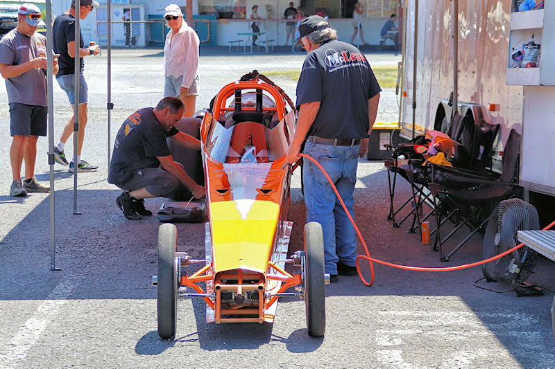 These days, in the racing world, everyone pitches in to take care of the car, often with each pit member having a specific task. With Dawn growing up in a racing family, I was curious about what part she played in taking care of the dragster beyond driving it. She revealed, “These things don’t have much maintenance to ‘em. I check the pipes to make sure there’s no cracks in them. When you see me start up, you’ll see the smoke come out, it means we’re just checking for cracks in the pipes. Pretty much these things are very easy to work on. I fill it up, we bleed it for air in the fuel, and pack the chutes and that’s it. It’s very simple. Not bad at all. It’s hard to find these parts in these engines, that’s why not a lot of people have these things, because they’re hard to find. And if people have them they keep them or they charge a lot of money for them. If they were easier to find, a lot more people would probably be driving them.”
