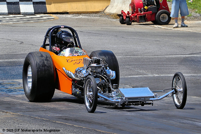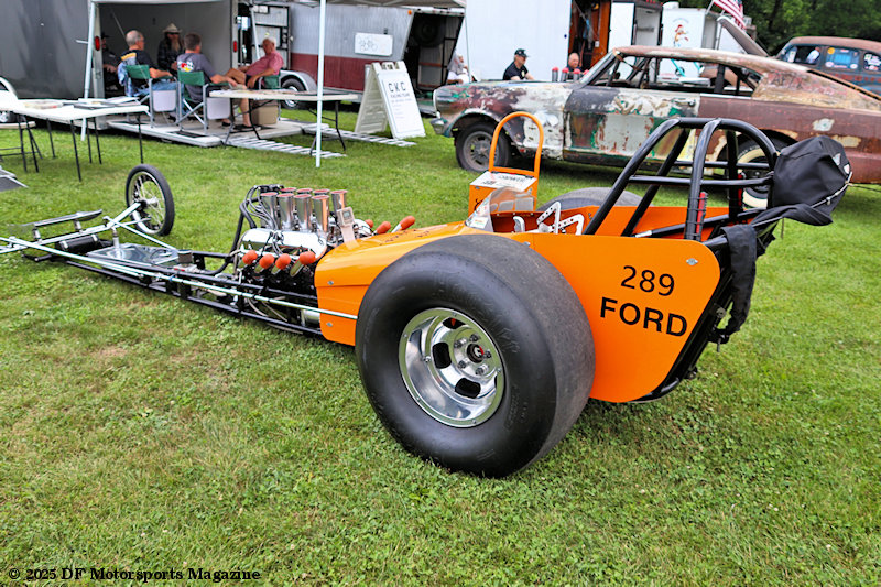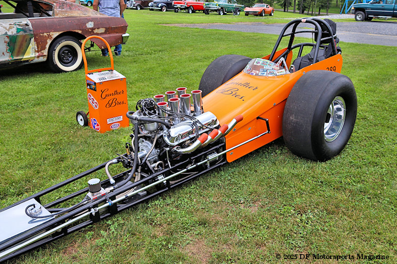 According to Jeff, “Basically my dad ran a small-block Ford dragster from 1964 on up to 1972. He set a lot of national records, he won a lot of races, he ran nitro, 98% nitro. Once the big Hemis came in the picture he was still racing with them, but then they decided to make another class called Junior Fueler and my dad and another buddy of his Bud Hahn, raced that class. They did real well in that, that was for a small block Ford or Chevy small cubic inch motor and they did real well there [in the class]. They branched out and was running a lot of races up and down the east coast, they ran a lot of match races, so they did real good with the car. I got a lot of history on the car, a lot of pictures a lot of records, national records, so when I got older I tried to find the car. My dad passed away and I tried to find the car, couldn’t find the car, I come to find out he built 6 different dragsters, I couldn’t find any of ‘em. So we decided to build our own car. I found a guy up in Pittsburgh with a full running car. It had a small block chevy in it, the chassis was the right, period correct. The wheels and everything looked like one of my dad’s cars. We bought the dragster out of Pittsburgh, took it back to my shop, tore everything completely apart. [We] changed everything, did bodywork on the car, my brother painted the car to the original orange color my dad ran, we lettered it in black lettering just like my dad’s cars, and we’re running, believe it or not, his factory block, his factory crank, his factory rods, his factory heads, the valve covers, the magneto, the zoomie pipes, the oil pan so we were running basically his same type of engine.”