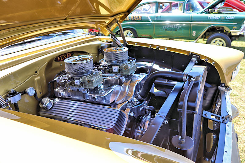 The car, itself, is a 1955 Model 210 Chevrolet. It’s a father-son build that was built up from a bare shell. An amazing part of the car’s story is that it was a survivor of a garage fire. Duncan relates it took them six years to build it the first time, than about another two years to fix it from the fire. Windows from the garage fell through the front clip, so they had to dismantle the car. All the chrome on the car was ruined in the fire. They had to repaint the front clip and replace the headliner. Amazingly, they were able to save the seats and able to save the paint from the firewall back.