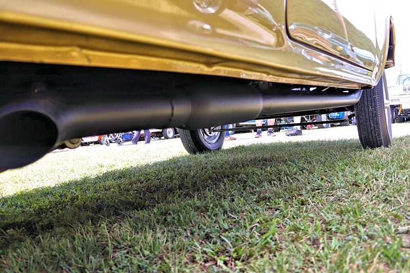 The craftsmanship on this build is impressive and the Duncans are responsible for nearly all of it. They designed and built the front sub-frame, did all the metal work, all the paint work, did all the rust repair underneath on a rotisserie, and painted the underneath. Usually, you don’t think of the sub frame of a car as an area for special details, but this mostly-hidden part of the car came with a lot of thought put into it. Duncan pointed out, “When we laid out the frame rails, we wanted it so when you looked you wouldn’t see anything. You don’t see brake lines, you don’t see bolts, you don’t see fittings. We set the ride height up so everything’s level, the steering links, drag links, everything’s parallel on the front suspension.” Duncan added other details, “ I painted it myself, it’s ‘65 Tiger Gold. We drew up the upholstery for the upholstery shop. The upholstery is from a new Tesla. The company I work for manufactures that material, so we used that to do the car. It’s a fun street car, we enjoy going out to the events and we host Full Throttle Performance Car Club, it’s our car club, and we host charity car shows so I always take it to that. It was a fun build. The car rides and drives and handles nice. The front steering is a Vega box, [with a] shorter column.” I was curious about what kind of miles per gallon this setup achieved, and was amazed when Duncan responded it got 10-11 miles per gallon when last checked, a very impressive feat for that kind of power. The proverbial cherry on the top of this very streetable hot rod is the green LED lights in the dash coupled with green footwell lights that give off a green glow when driving at night.