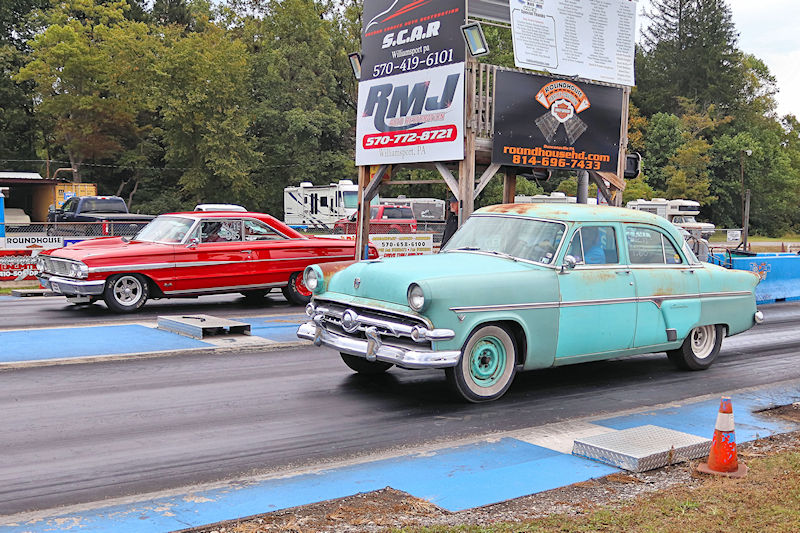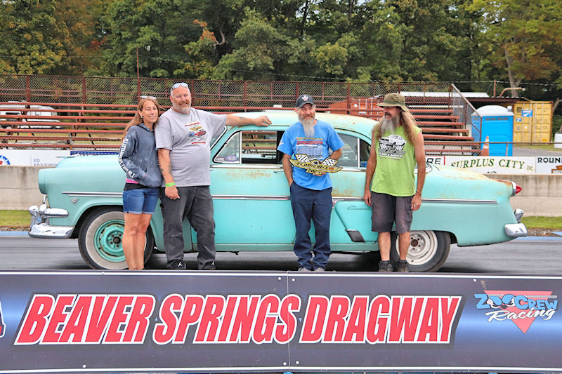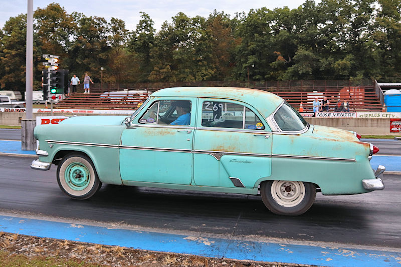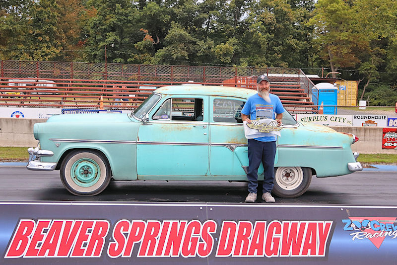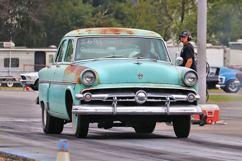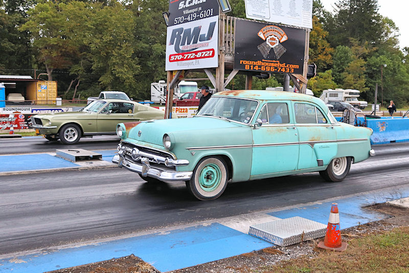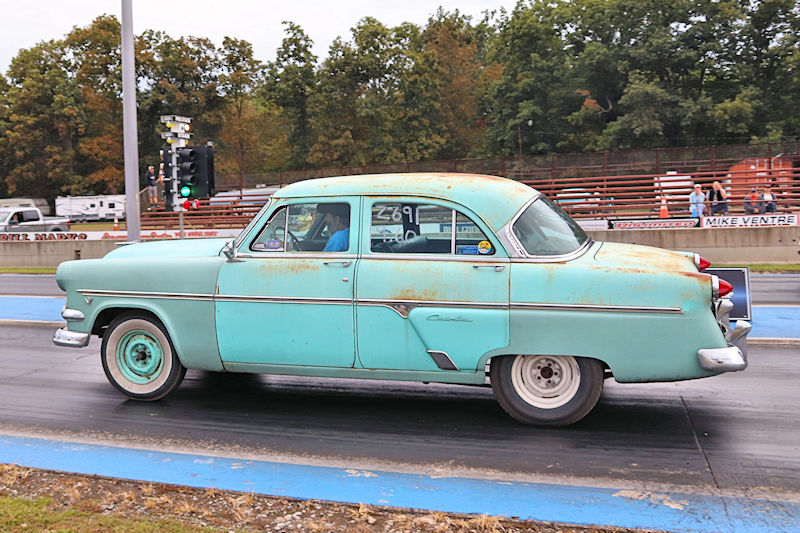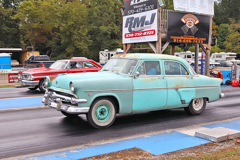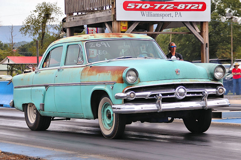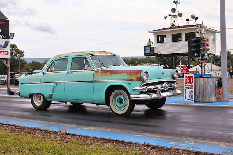 Beaver Springs Dragway – Imagine it’s your typical day at the drag strip. It’s original FE day at Beaver Springs, so there’s lots of cool Mustangs, Comets, Fairlanes and similar Fords rumbling about the staging lanes and roaring down the track. Then you turn your head and find it’s time for something completely different (apologies to Monte Python). You’ve suddenly been confronted by the ‘54 Customline Sedan of Ben Knechel. The car has the look of something that’s just escaped a barn, or perhaps a car that’s been daily driven since it rolled off the assembly line. Either way, you immediately know this isn’t your normal race car. It’s far more special than that.